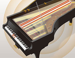 In a grand piano, strings and sounds resonate throughout the entire body of the instrument producing a rich reverberation that envelops the listener in sound. Not only are the strings you are playing vibrating, but other strings ring as a reaction to ones you play. This is one reason the piano sound is so complex and rich.
